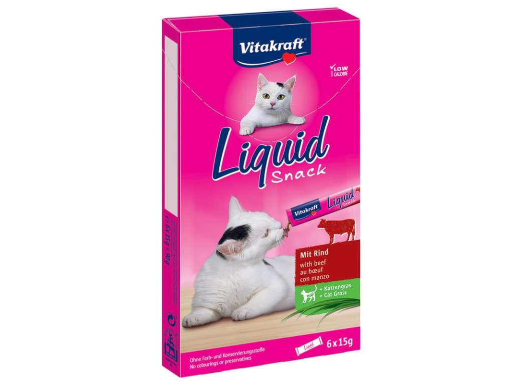 Vitakraft Cat Liquid Snack s hovězím a inulinem vyniká čirou chutí a využijete jej jako lahodnou odměnu nebo zálivku na hlavní krmení, o které Váš miláček nemá zájem. Díky gelové konzistenci a vynikající chutí je u koček velmi oblíbený. Navíc neobsahuje žádná barviva ani konzervační látky.