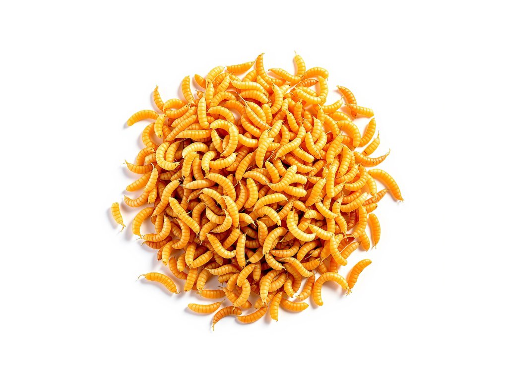 Sušený moučný červ (larvy Potemníka moučného), krmivo s vysokým obsahem bílkovin.