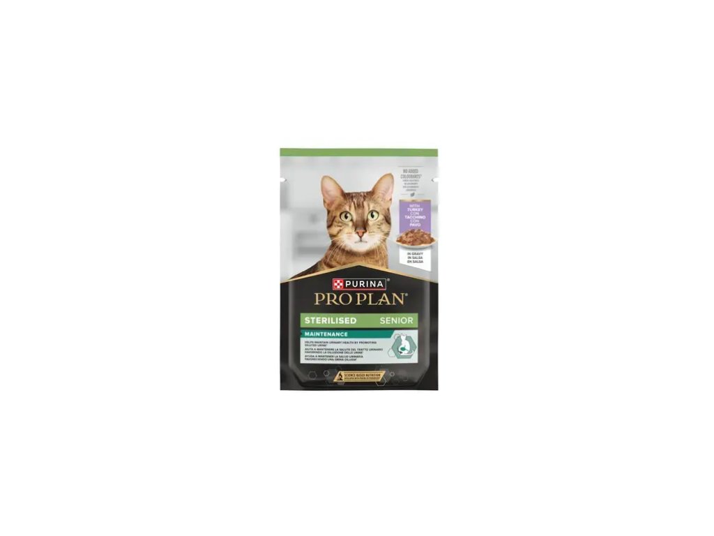 PURINA® PRO PLAN®Senior 7+ Sterilised, Maintenance, s krůtou ve šťávě pomáhá prokazatelně podporovat zdravé zažívání.