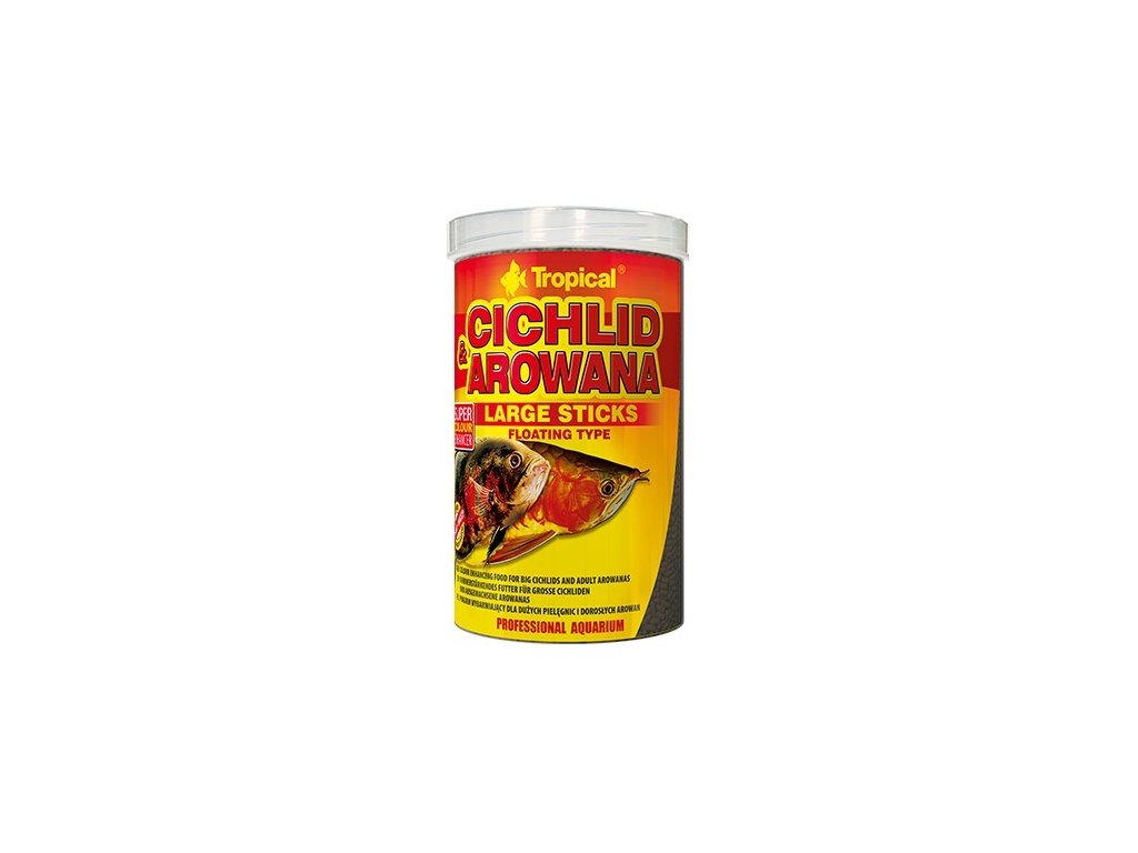Mnohosložkové krmivo zvýrazňující zbarvení v podobě plovoucích tyčinek, určené ke každodennímu krmení velkých cichlid, dospělých arowan a dalších středních druhů všežravých a masožravých ryb, které dosahují větších rozměrů. Cichlid & Arowana Large Sticks obsahuje vysoký podíl přirozených barviv, včetně rybami dobře stravitelného astaxanthinu. Barvy ryb, které dostávají pravidelně tyčinky, získávají na intenzitě a lesku. Lehce stravitelné bílkoviny a optimálně zvolené spektrum vitamínů a mikročástic mají vliv na rovnoměrný růst a perfektní kondici ryb. Imunitní systém aktivuje stabilizovaný vitamín C a silný přírodní imunostimulátor – beta-glukan.
