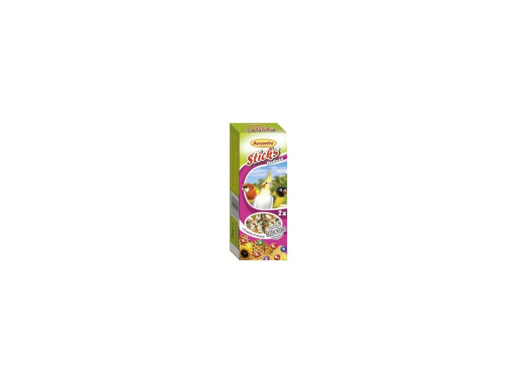 Doplňkové krmivo pro malé a střední papoušky. Tyčinky s ovocem a ořechy/vitamíny a medem jsou výbornou pochoutkou, ale také krmivem, které Vašemu mazlíčkovi dodává důležité vitamíny a minerály pro zdravý a vitální život. Tyčinky jsou speciální krmivo, kde musí Váš mazlíček vyvinout úsilí k získání své potravy podobně jako v přirozeném prostředí. To napomáhá jeho fyzické a psychické kondici.