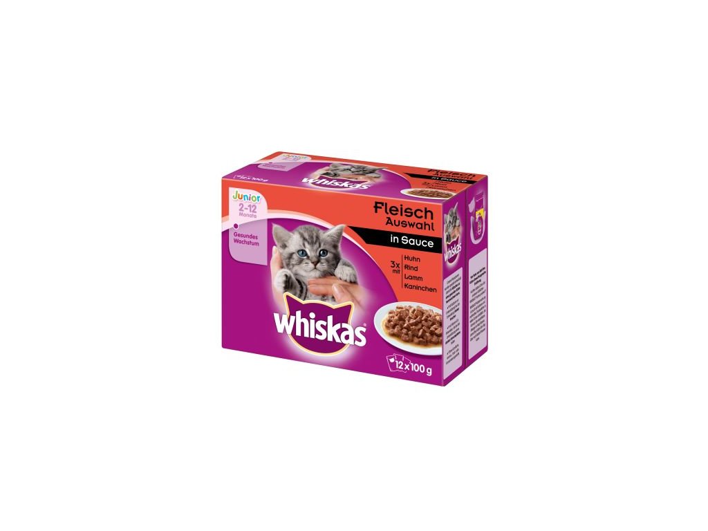 Whiskas junior - kapsičky s králičím, kuřecím,hovězím a jehněčím masem ve šťávě.